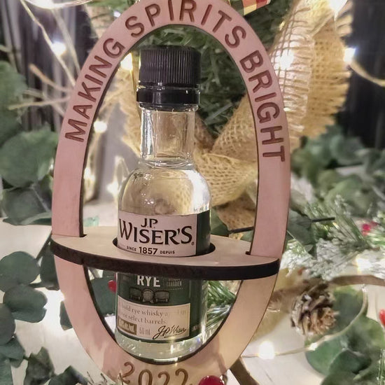 Give the gift of joy to your friends with these Mini Liquor Bottle Ornaments. 2022 Christmas Ornament - Making Spirits Bright. This ornament holds mini alcohol bottles (a list of the bottles that fit are listed below) and stores flat when done using to prevent damage and to save space.